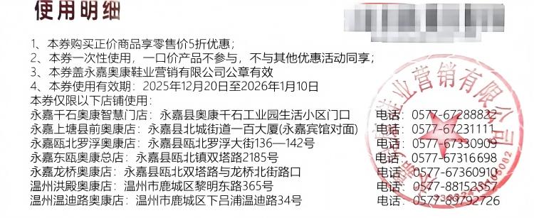 1、本券购奥康正价商品享零售价5折优惠。 2、本券一次性使用,一口价产品不参与,不与其他优惠活动同时进行。 3、本劵盖永嘉奥康鞋业营销有限公司公章有效。 4、本劵有效期2025年12月20至2026年1月10日。 5、本券仅限以下店铺使用。