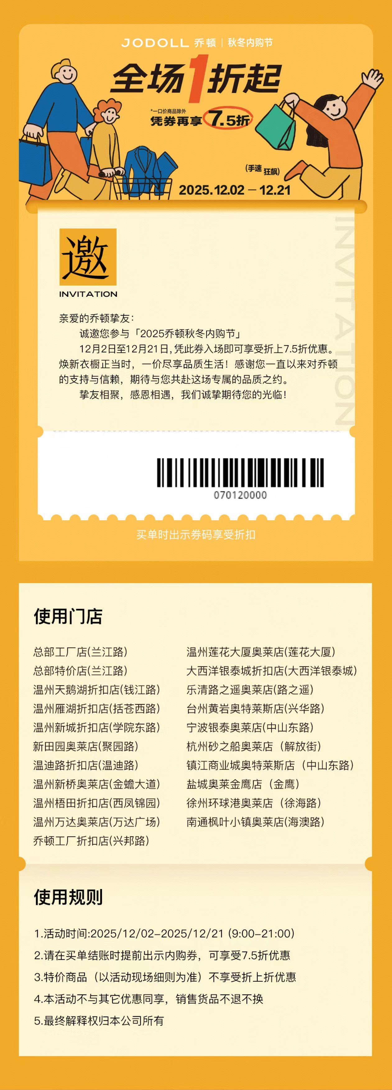校友福利㉗ | 2025乔顿秋冬内购券——全场1折再凭券享7.5折(享受折上折优惠)