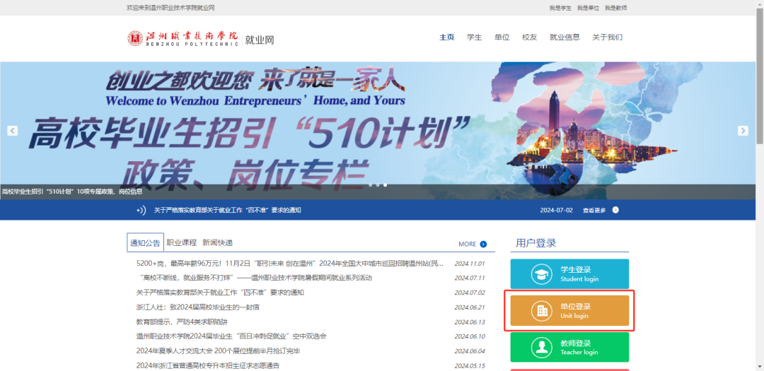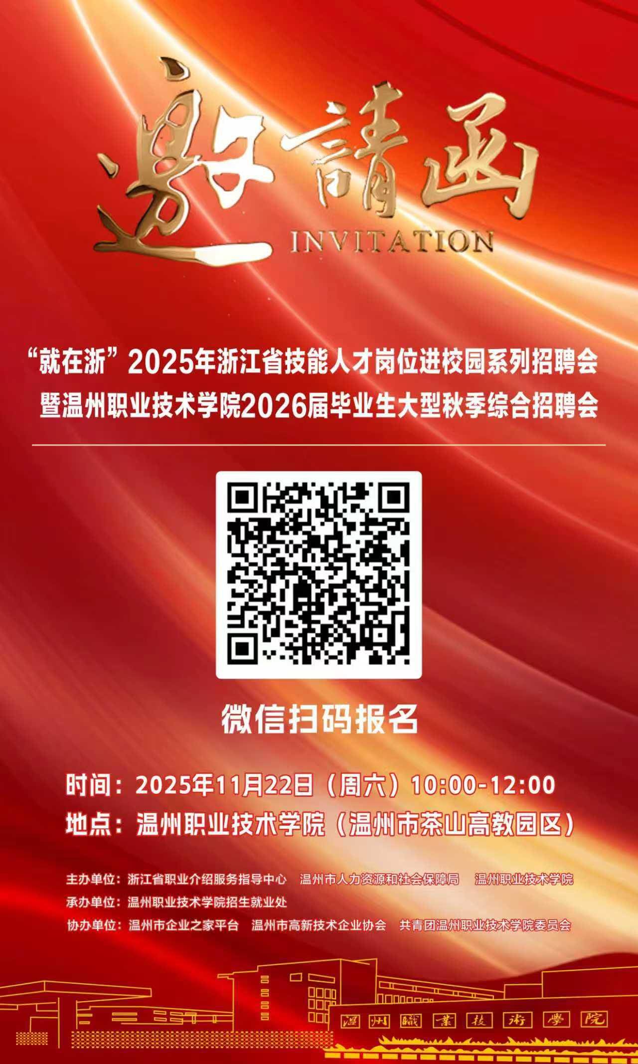 衷心感谢贵单位多年来对我校毕业生就业工作的关心和支持!为深入贯彻落实党中央、国务院及省委省政府关于高校毕业生就业工作的决策部署,切实推动高校毕业生高质量充分就业,持续推进毕业生与用人单位精准供需对接,我校将举办“就在浙”2025年浙江省技能人才岗位进校园系列招聘会暨温州职业技术学院2026届毕业生大型秋季综合招聘会。现诚挚邀请广大用人单位莅临我校招贤纳士。