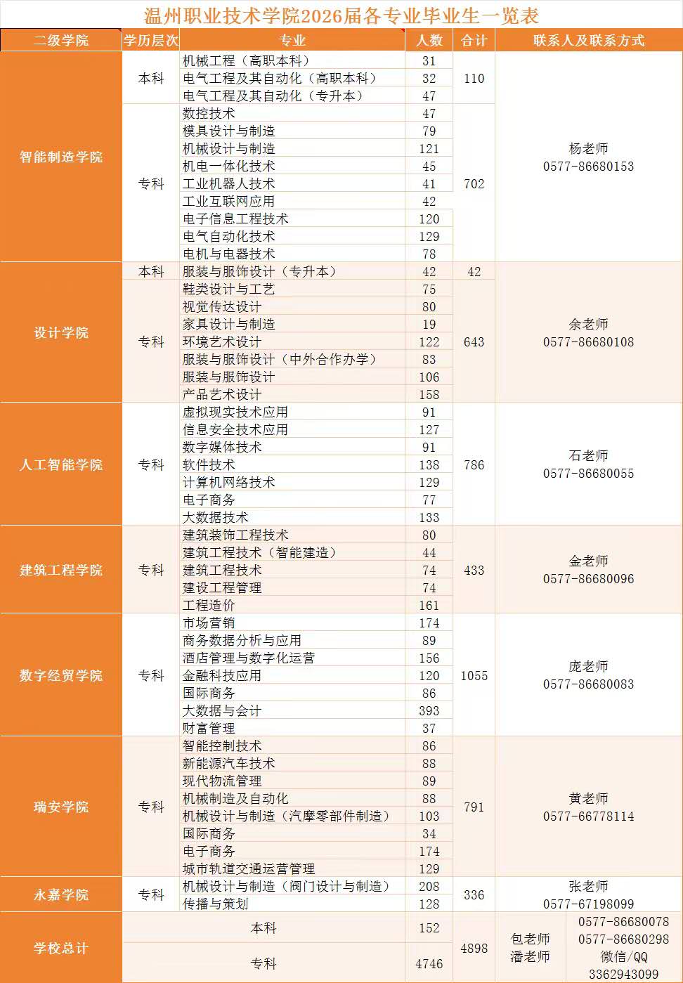 温州职业技术学院是1999年经教育部批准创办的全日制综合性高职院校,是浙南闽北唯一一所中国特色高水平高职学校、国家示范性高职院校、全国优质高职院校,是全国职业教育先进单位、全国黄炎培职业教育奖优秀学校、浙江省重点高职院校、浙江省文明校园、全国创新创业典型经验50强高校、教育部首批现代学徒制试点单位、浙江省首批四年制高职教育人才培养试点院校和省首批专升本高职本科人才培养试点院校。2025年,学校再次以优异成绩入选中国特色高水平高职学校。学校设有智能制造学院、设计学院、人工智能学院、建筑工程学院、数字经贸学院、鹿城学院(继续教育学院)、瑞安学院、永嘉学院、公共基础学院、马克思主义学院、国际教育学院(丝路学院)等11个二级学院,2026届毕业生共4898人。现将相关事项函告如下: